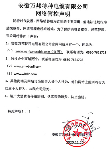 鄭重聲明:安徽萬邦特種電纜有限公司官方網站為:www_wanbangcable_com.bxwjc.cn,除此之外無任何子網站或合作網站,其余均為假冒偽劣。電話:0550-7621728 13485756353 地 址:安徽省天長市滁州高新技術產業開發區經四路29號